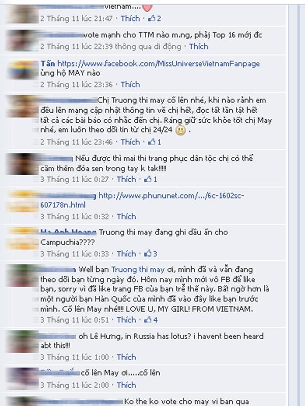 Trong khi đó, NTK Đức Hùng một người rất quan tâm đến các quốc thi nhan sắc trong nước và quốc tế cũng gửi lời chúc và động viên Trương Thị May với chia sẻ: "Trên đấu trường sắc đẹp, một nụ cười toả nắng sẽ là cú đấm hiểm trên võ đài. Em sốt cao, mà vẫn tươi được thế này thì biết em đã làm hết mình vì màu cờ sắc áo Việt Nam. Top 5 , 10, 16 ... không còn quan trọng nữa, May đã để lại ấn tượng đẹp cho các bạn bè quốc tế một hình ảnh con gái Việt Nam thật tuyệt. Biết đâu em lại trở thành đương kim Hoa hậu Hoàn Vũ thế giới 2013. TẠI SAO KHÔNG?".