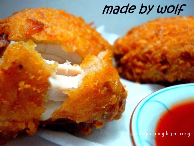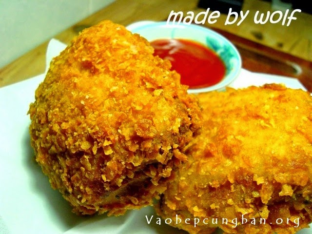 - Chúng ta lăn lần lượt qua lớp bột khô >> rồi áo 1 lớp bột ướt mỏng bên ngoài >> cuối cùng là lớp bột ngũ cốc vụn.